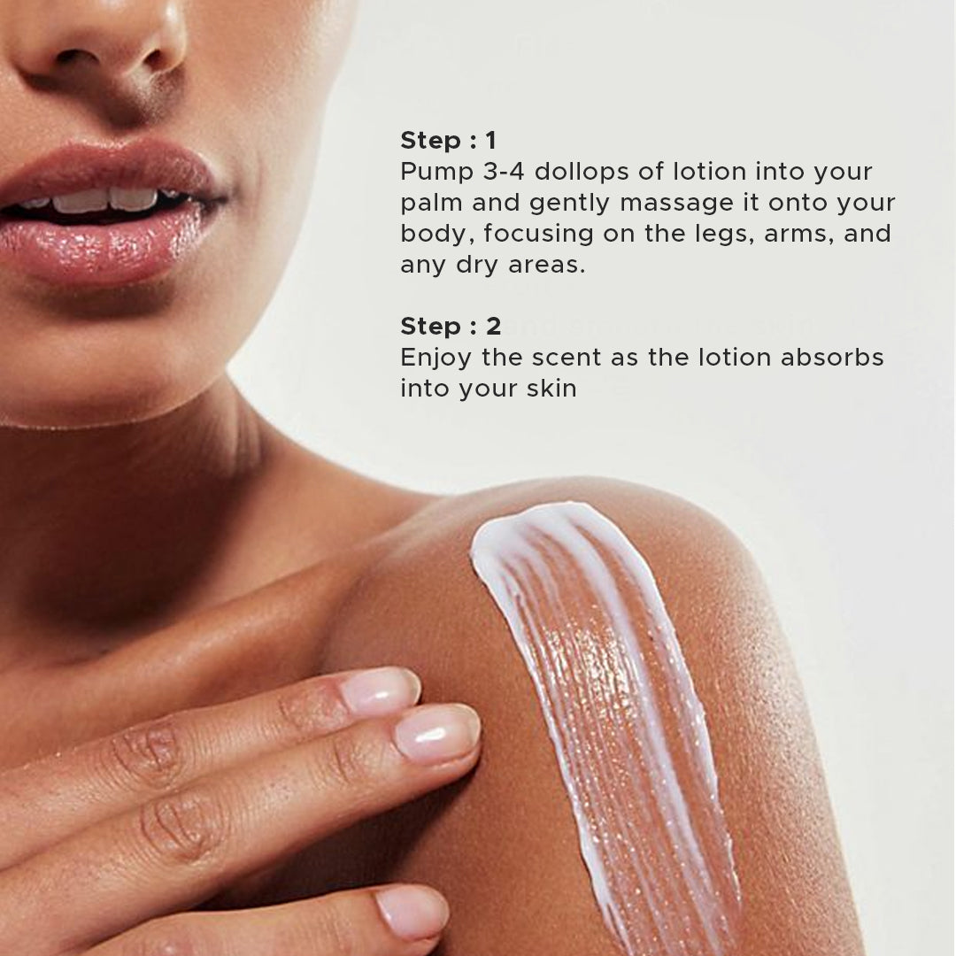 Pump 3-4 dollops of lotion into your palm and gently massage it onto your body, focusing on the legs, arms, and any dry areas. - Step : 2